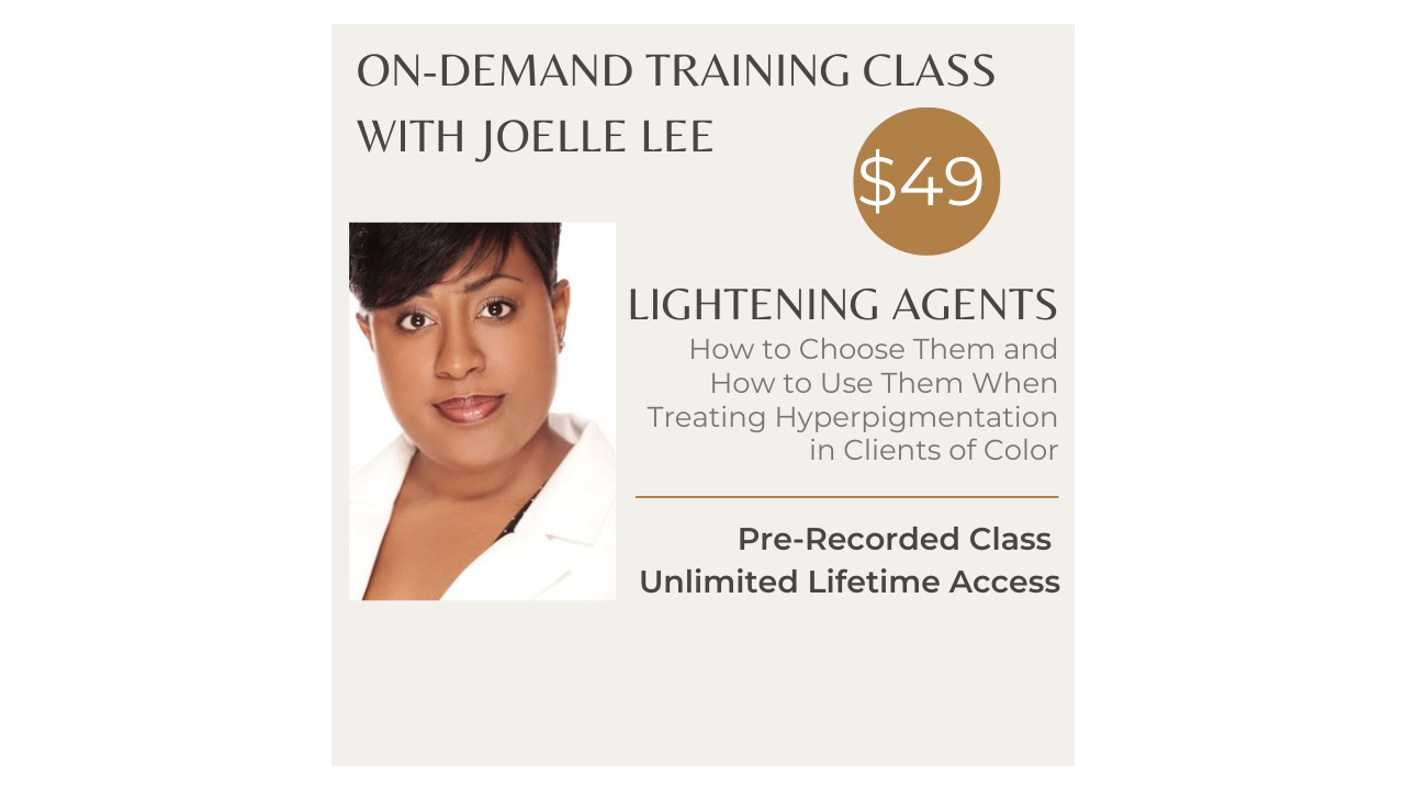 In this pre-recorded class, you will learn about several different types of lightening agents and how to effectively incorporate them into your skincare treatments and protocols for your clients of color. You will also learn how to rid your clients of color of hyperpigmentation, melasma, and other skin discolorations with the use of lightening agents and how to combine lightening agents with other treatment modalities and products to ensure rapid and optimum results.